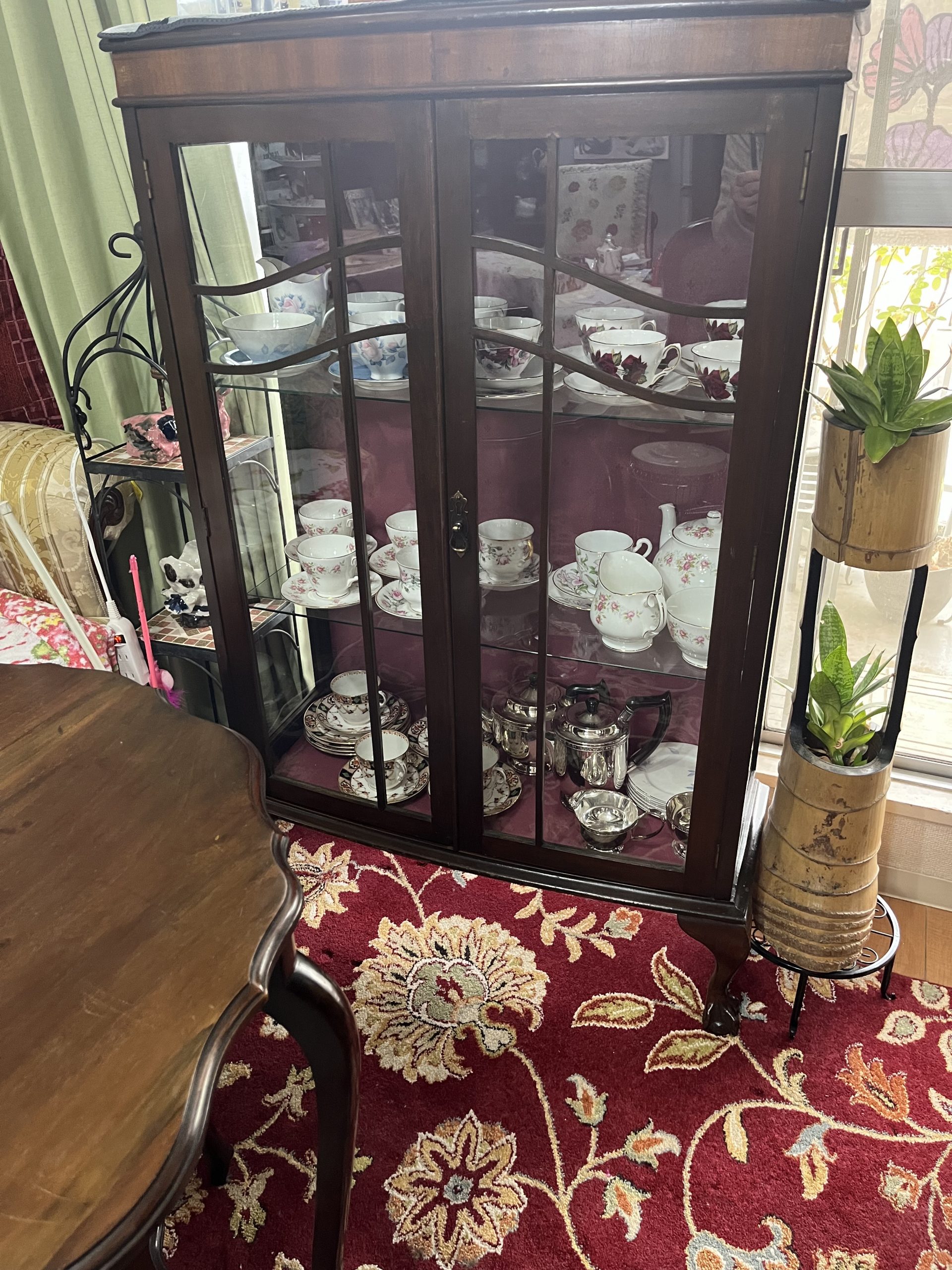 足元のボールアンドクロウが素敵なマホガニー材の美しい木目が印象的なショーケースと