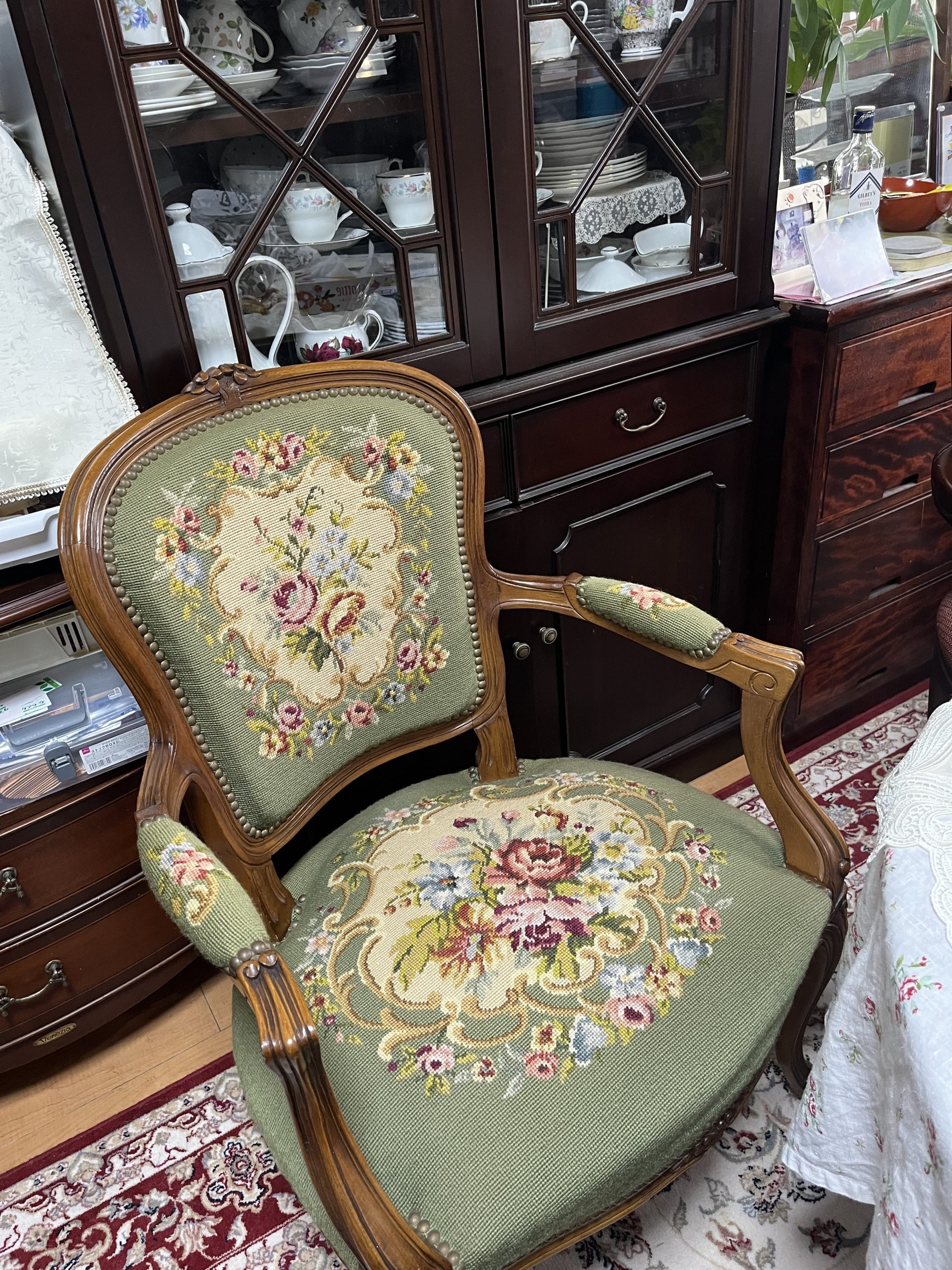 フランスアンティークならではの装いがたまらないプチポワンアームチェアです。