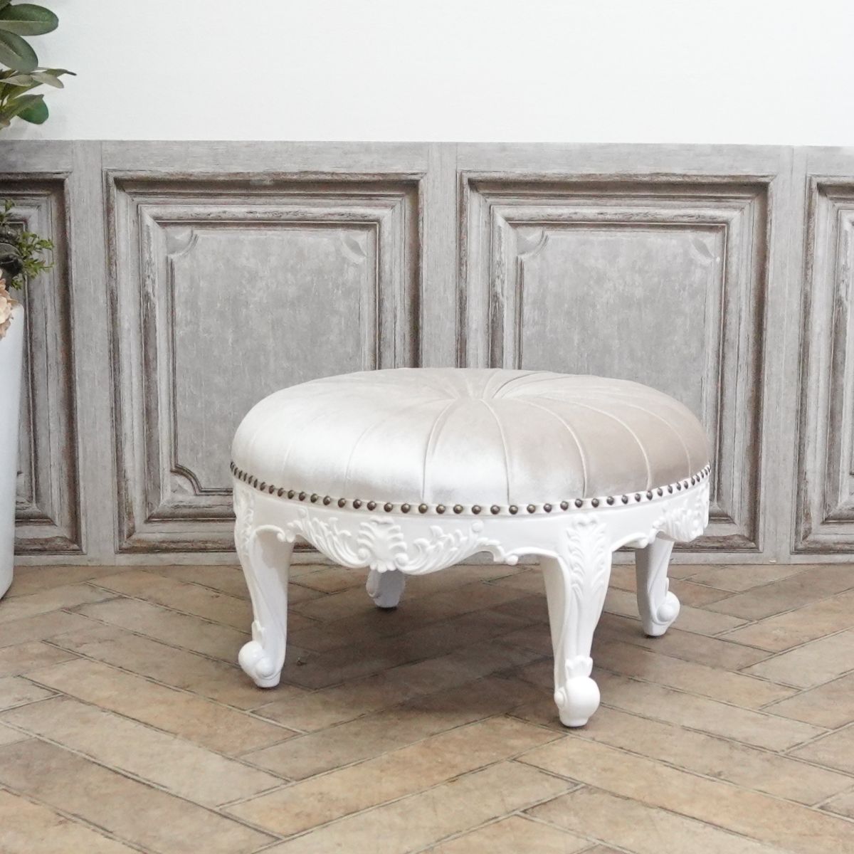 繊細な彫刻と猫脚が魅力のオットマンです。